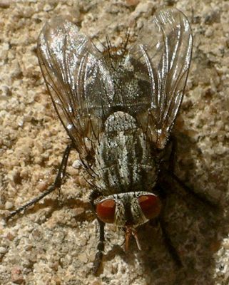 Six participants braved the very cold, windy morning to conduct this week's survey. Although it was sunny, the low temperature and very strong winds made invertebrates difficult to find, hence the short list this time. One notable sighting was the fruit fly shown below. The wing markings, when viewed from various angles, usually look like a jumping spider, and it is probable that this mimicry helps repel some predators.
